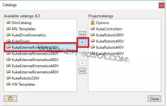 Step 2 選擇KukaExternalKinematics230V 點擊單個箭頭,添加到現有目錄