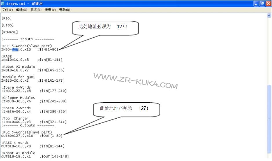 三、在C\KRC\Roboter\Init 文件夾的iosys.ini 文件的該行開通,并設置輸入輸出地址!