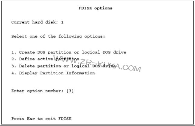 為了刪除分區或邏輯驅動器,在FDISK選項輸入數字“3”,用回車鍵確認。與刪除分區有關的指令都在子菜單“刪除DOS分區或邏輯DOS驅動”下。