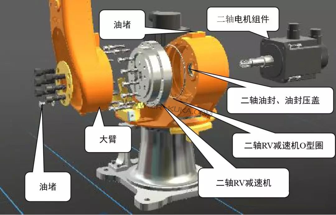 歐系的工業(yè)機(jī)器人一軸、二軸和三軸油腔密封方法基本相同,日系的由于潤(rùn)滑介質(zhì)不同略有差異,本次介紹的是歐系庫(kù)卡工業(yè)機(jī)器人關(guān)于泄露和油封更換的內(nèi)容。
