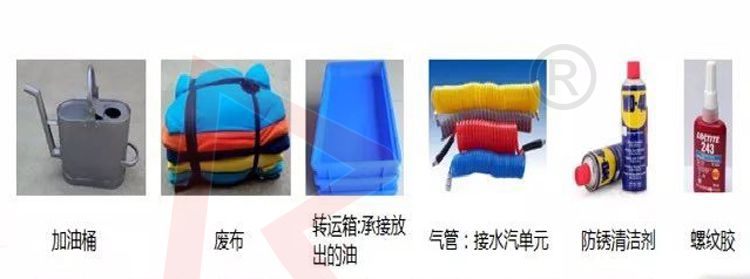 輔助設(shè)施;加油桶、廢布、接油桶、氣管、除銹劑、螺紋膠