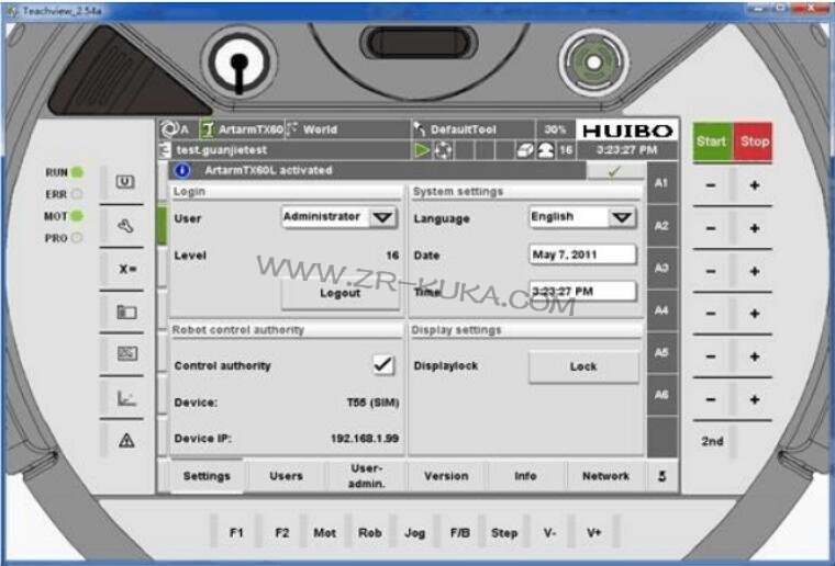 首先,登陸用戶,獲取控制權(quán)限,如圖4.1 是Administrator 用戶。注意觀察界面上方的狀態(tài)顯示欄。觀察狀態(tài)顯示欄是否為手動狀態(tài)。還要注意是否有伺服報警狀態(tài),及速度檔次。