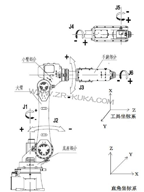 在HR20-1700-C10 系列機器人系統(tǒng)中設(shè)定了三種坐標系,即關(guān)節(jié)坐標系、世界坐標