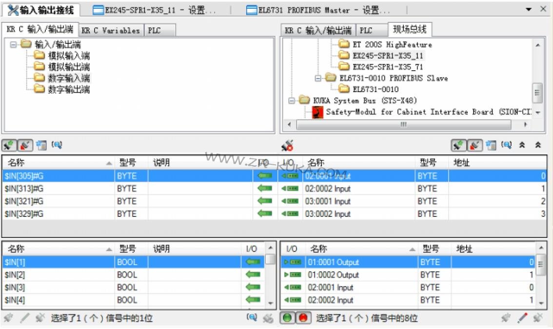 在窗口左半側的選項卡 KR C 輸入 / 輸出端中選定需接線的機器人控制系統范圍,例如:數字輸入端。信號在窗口輸入輸出接線的下半部分顯示。