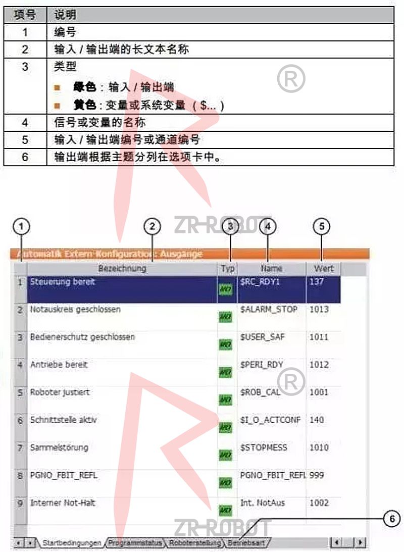 2.上級(jí)控制系統(tǒng)通過外部自動(dòng)運(yùn)行接口向機(jī)器人控制系統(tǒng)發(fā)出機(jī)器人進(jìn)程的相關(guān)信號(hào) (如運(yùn)行許可、故障確認(rèn)、程序啟動(dòng)等)。機(jī)器人控制系統(tǒng)向上級(jí)控制系統(tǒng)發(fā)送有關(guān)運(yùn)行狀態(tài)和故障狀態(tài)的信息。